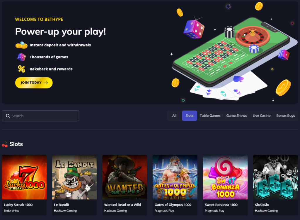 BetHype.com greets players with a sleek, dark-themed interface that feels both modern and professional. Navigation is quick and intuitive, with clearly labeled sections for games, promotions, and support. Whether you’re a beginner or a seasoned gamer, the platform is designed to feel familiar and accessible.