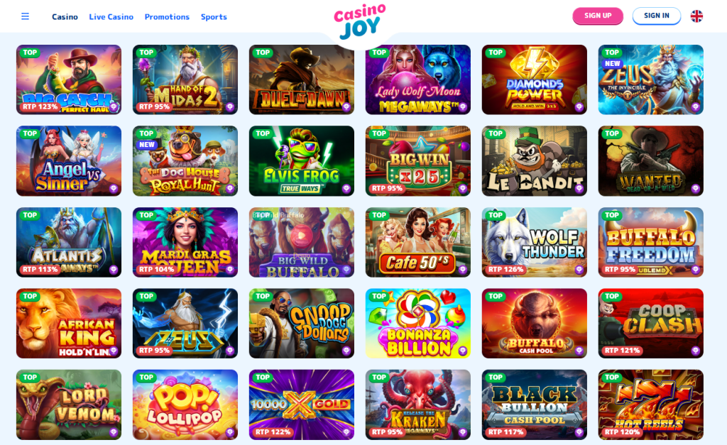 Casino Joy’s game variety is a major strength, featuring top picks across multiple categories: