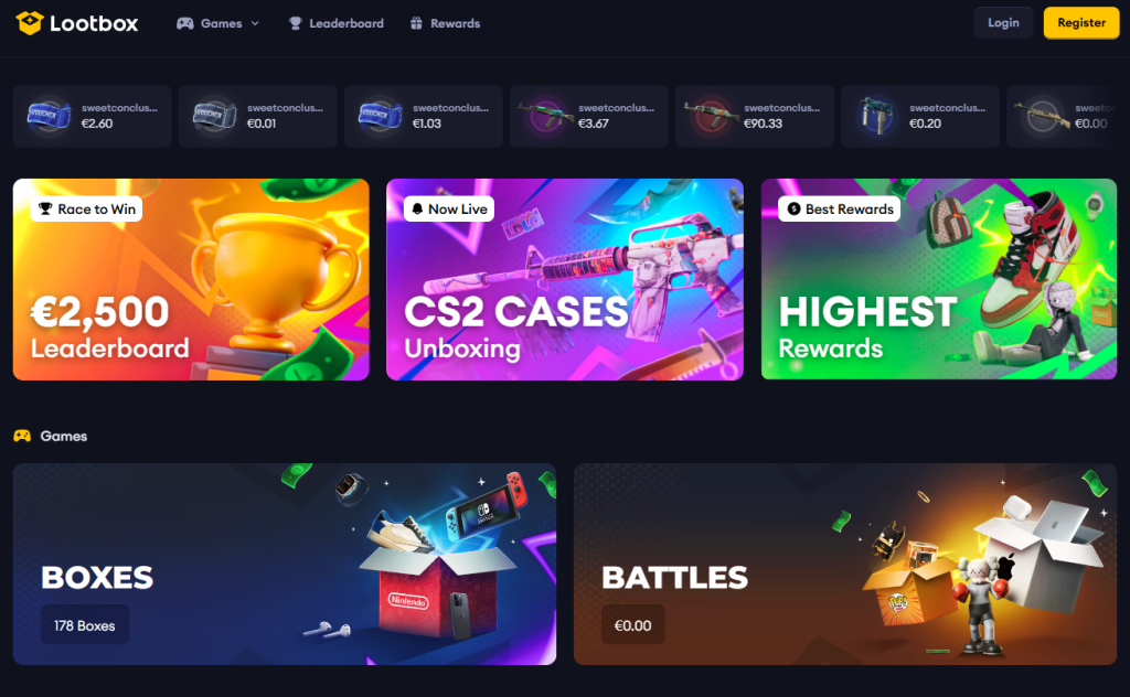 Lootbox.com doesn’t offer standard casino games like blackjack or roulette. Instead, users purchase and open loot boxes that offer randomized chances to win real rewards, including crypto (BTC, ETH), in-game items, rare skins, NFTs, and physical merchandise.